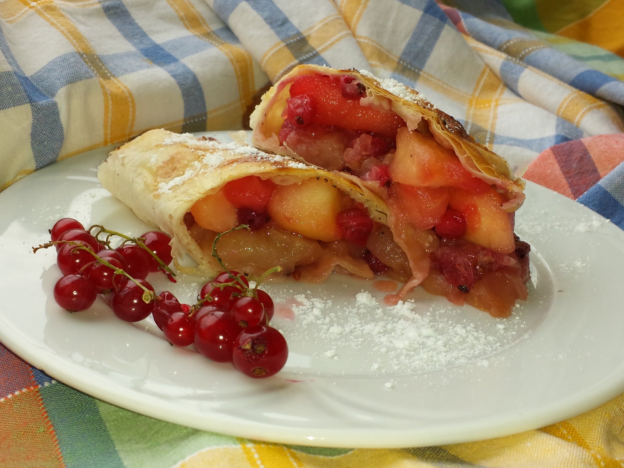 Olvasszuk meg a vajat mikrohullámú sütőben és keverjük hozzá a tejfölt. Terítsünk le egy konyharuhát az asztalra és fektessünk rá 2 db réteslapot. Egye ecset segítségével kenjük meg a vajas tejföllel minden hol és fektessük rá a harmadik réteslapot. Szintén kenjük meg, majd helyezzük rá a negyedik lapot és a tölteléket töltsük hosszában a réteslap felénk eső részébe. A konyharuha segítségével tekerjük föl és helyezzük egy sütőpapírral bélelt tepsire. A rétes rudat alaposan kenjük meg a maradék tejföllel. Ügyeljünk hogy a rétes két végét is alaposan kenjük a vajas tejföllel.