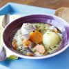 Pirítsuk meg a hagymát az olajon, adjuk hozzá a felkockázott csirkemellet és pirítsuk 2-3 percet. A felkockázott zöldségeket a csirkéhez adva sózzuk és borsozzuk, majd pároljuk 2 percet. Engedjük fel vízzel és forrás után közepes lángon, főzzük puhára a zöldségeket. A kevéske hab, ami majd a leves tetején képződik, távolítsuk el egy kanál vagy szűrő segítségével. Ízesítsük újra sóval és borssal, reszeljük bele a fokhagyma gerezdeket, utánna közben készítsük el a habarást. A púpozott kanál lisztet simára keverjük a tejjel, hozzá adjuk a tejfölt és azzal is simára keverjük. A levesből merjünk a habaráshoz két merőkanál levest és keverjük jól össze, majd adjuk a leveshez és folyamatosan kevergetve forraljuk 1-2 percet. Tálaljuk és fogyasszuk egészséggel.